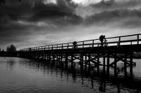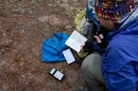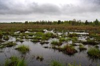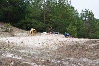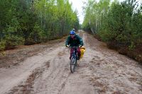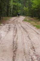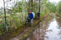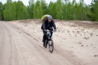Всю ночь между вторым и третьим днём лил дождь. Спать в палатке, когда по ней барабанят капли, очень приятно, тепло и уютно. Однако не всем было так хорошо. Саша, который спал с краю, утром проснулся с мокрым спальником, ибо палатка была плохо натянута и тент соприкасался с внутренней палаткой. Ночью, выйдя подышать свежим воздухом, можно было увидеть на противоположном берегу огромный костёр. Это рыбаки, сжигая за собой мосты, грелись у костра. Как только рассвело, тарахтенье мотоцикла дало нам знать, что они уехали. Из-за дождя и проблем с костром, сборы затянулись. Кроме того палатку не удалось просушить и много вещей намокло, поэтому Victogan-у пришлось везти несколько килограмм лишней воды (он у нас был главным по палатке). Выехали только в 10.00. Дорожки были точно такие, что и в конце прошлого дня, однако дождь хорошо прибил песок и передвигаться было значительно легче. Но перегруженный велосипед Victogana совершенно не хотел ехать, поэтому пришлось несколько распределить мелкие вещи Рэйману и Лёше37, и все поехали если не быстрее, то гораздо равномернее. Дальше были всё те же замечательные болота, огромные лужи, не проезжаемый песок и отличный сосновый лес урочища Мерлинские хутора, которые тоже были отселены в 60-е и дали название полигону «Мерлин». Лёша37 вновь измерял радиационный фон, но тщётно – всё как на курорте :) Только одинокие мелкие сосенки на фоне серого мха заставляли задуматься, а где мы сейчас? уж не в тундре ли мы оказались. Мелкий дождик лишь дополнял ощущения. Однако, для полноты картины и ощущений не хватала маленький северных белых лисичек и северных оленей. Полигон обладает одной занимательной особеностью: очень быстрая смена природных зон: еще 300 метров назад был отличный лес, а сейчас же большая песчаная пустыня, плавно переходящая в болото. Завал пытлвся искать виденный им 3 года наза остов БРДМ, но тоже не нашёл. Что бы выбраться из болот, нам понадобилось около пяти часов. Дождь начал затихать и к 13.00 совершенно прекратился. Средняя скорость передвижения составляла 5.5 километров за час. Ближе к концу полигона она увеличилась до шести. Поворотным моментам улучшения дороги стала вышка на бывшем КПП полиона. Там же остались развалины зданий, каким то чудом уцелел туалет. Рядом с вышкой был колодец, рядом с ним палка с пластиковой бутылкой, что бы черпать оттуда воду (здесь очень высокий уровень грунтовых вод). Измерение дозиметром уровня загрязнённости воды показало что уровень загрязнения радионуклидами даже ниже чем в водопроводе города Минска.